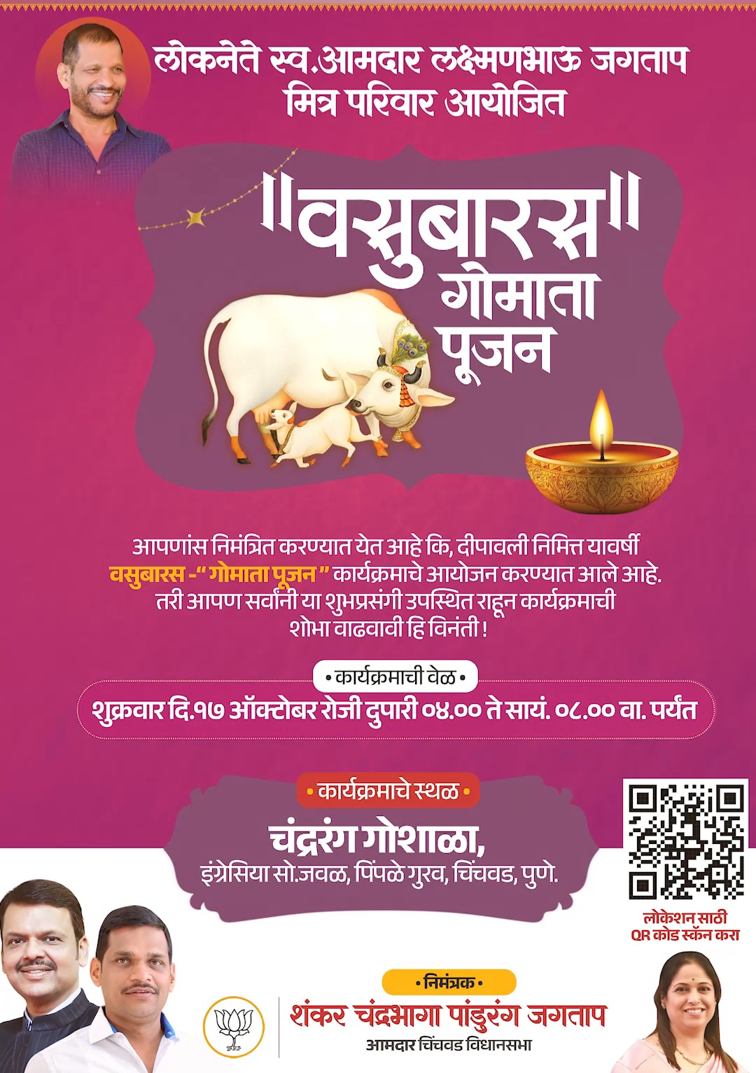 याचेच औचित्य साधून चिंचवड विधानसभेचे आमदार शंकरभाऊ जगताप यांच्या मार्गदर्शनाखाली लोकनेते लक्ष्मण जगताप मित्र परिवाराच्या वतीने पिंपळे गुरव येथील ‘चंद्ररंग गोशाळा‘, इंग्रेसिया सोसायटीच्या जवळ, पिंपळे गुरव या ठिकाणी परिसरातील नागरिकांच्या व महिला भगिनींच्या करिता “वसुबारस -” गोमाता पूजन” कार्यक्रमाचे आयोजन करण्यात आले आहे. यावेळी सायंकाळी 04 ते 06 या वेळात प्रसिद्ध गायक विशाल रसाळ यांच्या सुमधुर भक्ती गीतांच्या कार्यक्रमाचे ही आयोजन करण्यात आले आहे.